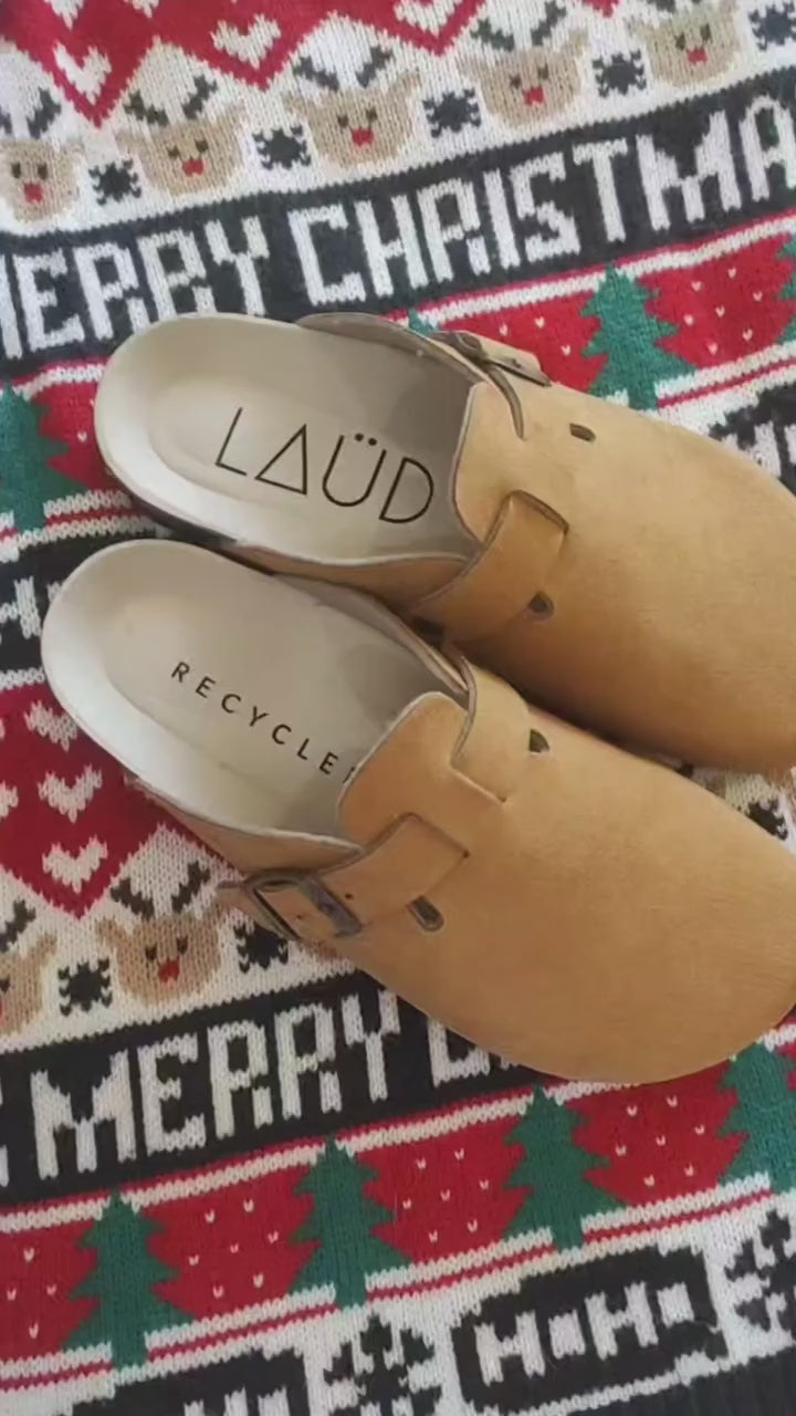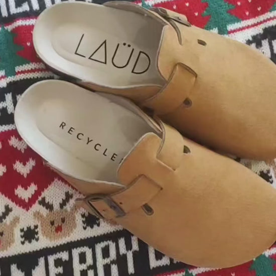 Sabot couleur sable avec détail boucle vieil or, avec un matériau en simili cuir végétalien. Semelle intérieure doublée en microfibre avec coussinets offrant un grand confort.