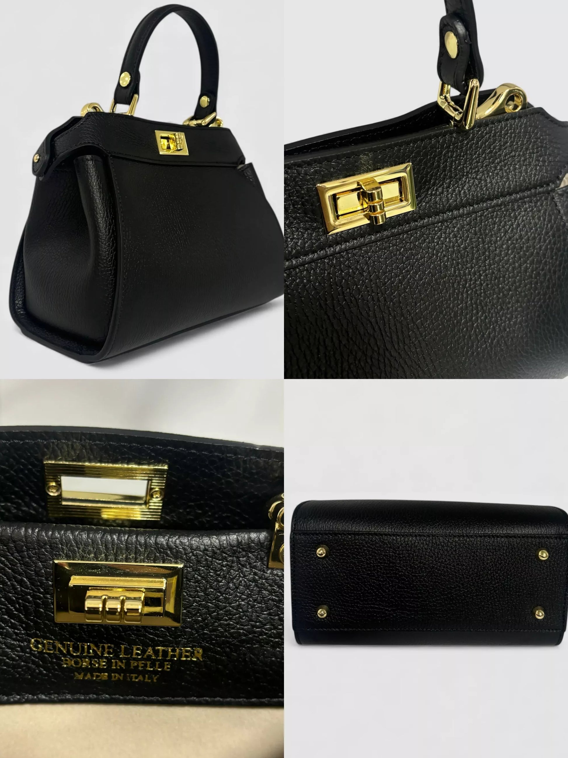 Sac à main en cuir véritable fabriqué en Italie, au design classique et élégant. Doté d'une bandoulière réglable, il peut se porter à la main pour un look raffiné, ou à l'épaule pour un style plus décontracté. Les ferrures dorées et la double ouverture confèrent une touche d'élégance intemporelle.